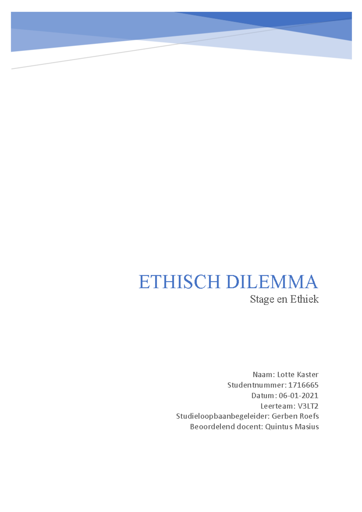 Verslag ethiek LK PDF voorbeeld ETHISCH DILEMMA Stage en Ethiek Naam Lotte Kaster Studeersnel