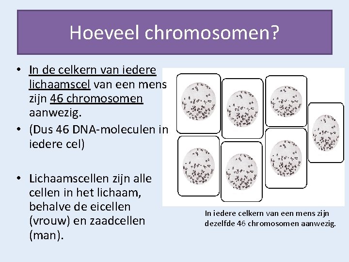 Wat is erfelijkheid? Het DNA van een mens is verdeeld over 23 paar chromosomen. Van elk paar krijg je er 1 van je vader (via de zaadcel) en 1 van je moeder (via de eicel). Het geslacht wordt ook door chromosomen bepaald: het X- en Y-chromosoom. Vrouwen hebben 2 X-chromosomen, mannen hebben 1 X-chromosoom en 1 Y-chromosoom.