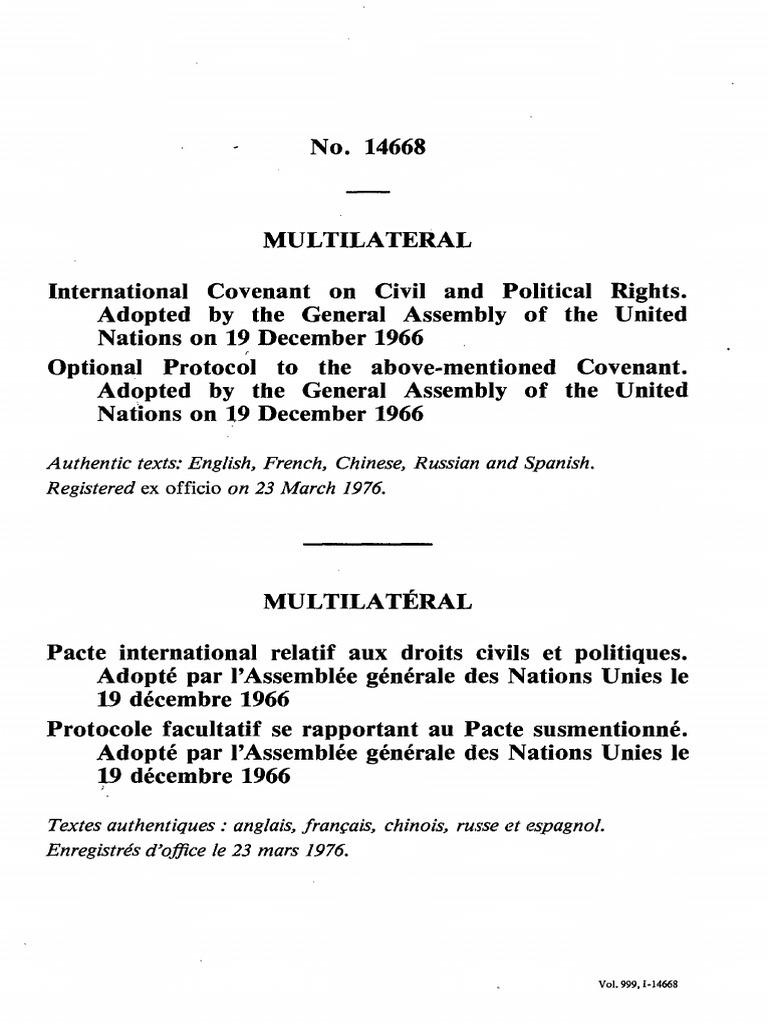 The International Covenant on Civil and Political Rights was adopted and opened for signature, ratification and accession by General Assembly resolution 2200A (XXI) of 16 December 1966. It took another 10 years before the necessary 35 States had become parties to it and it formally entered into force for those States on 23 March 1976, in.