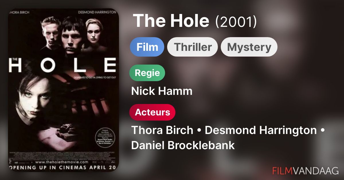 Released June 20th, 2001, 'The Hole' stars Thora Birch, Desmond Harrington, Keira Knightley, Laurence Fox The R movie has a runtime of about 1 hr 42 min, and received a user score of 62 (out of.
