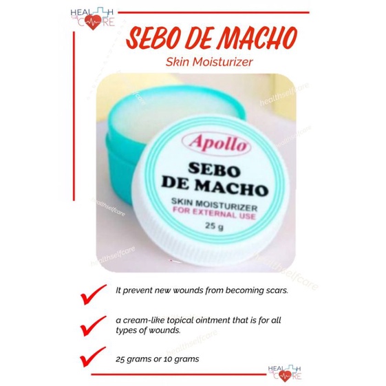 Apollo Sebo de Macho, a cream-like topical ointment that is for all types of wounds like bruises, abrasions, contusions, grazes or any type of wound in which the topmost layer of your skin is scraped off. Don't apply it to a fresh bloody wound but wait until the wound is about to dry and heal or about to form a scab then apply it over and.