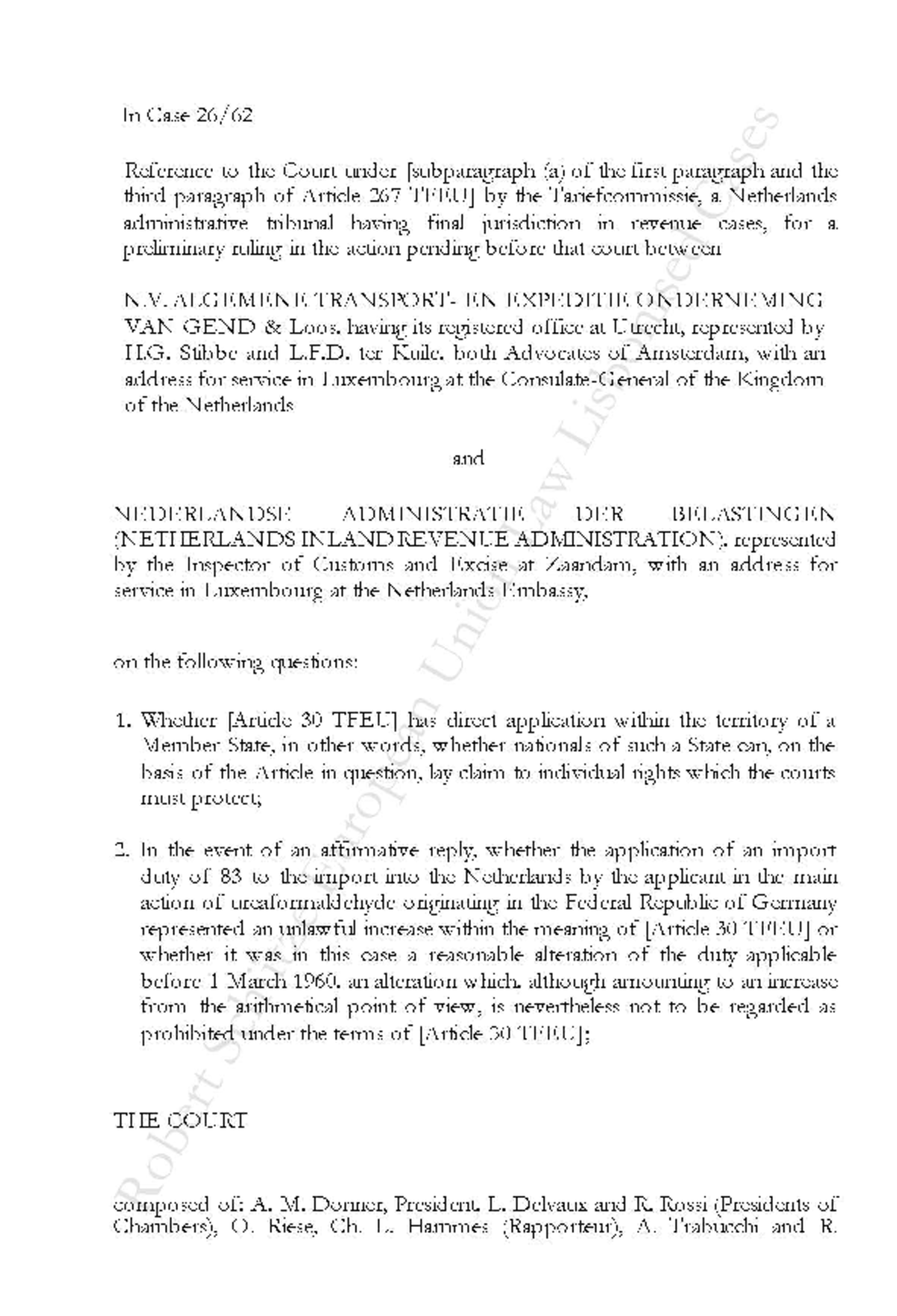 Summary of Case 62 26 62 Van Gend en Loos European Union Law Studocu